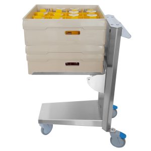 Stackningsbar korgdispenservagn. Sparar utrymme och förenklar hanteringen.