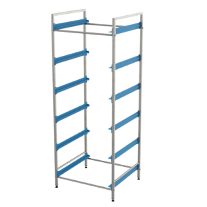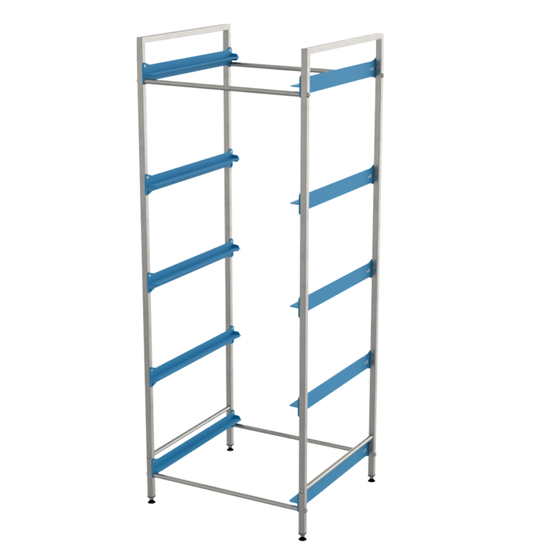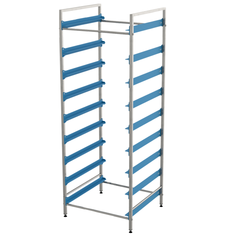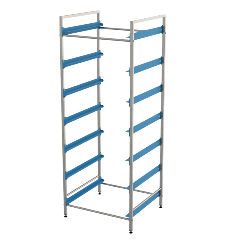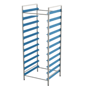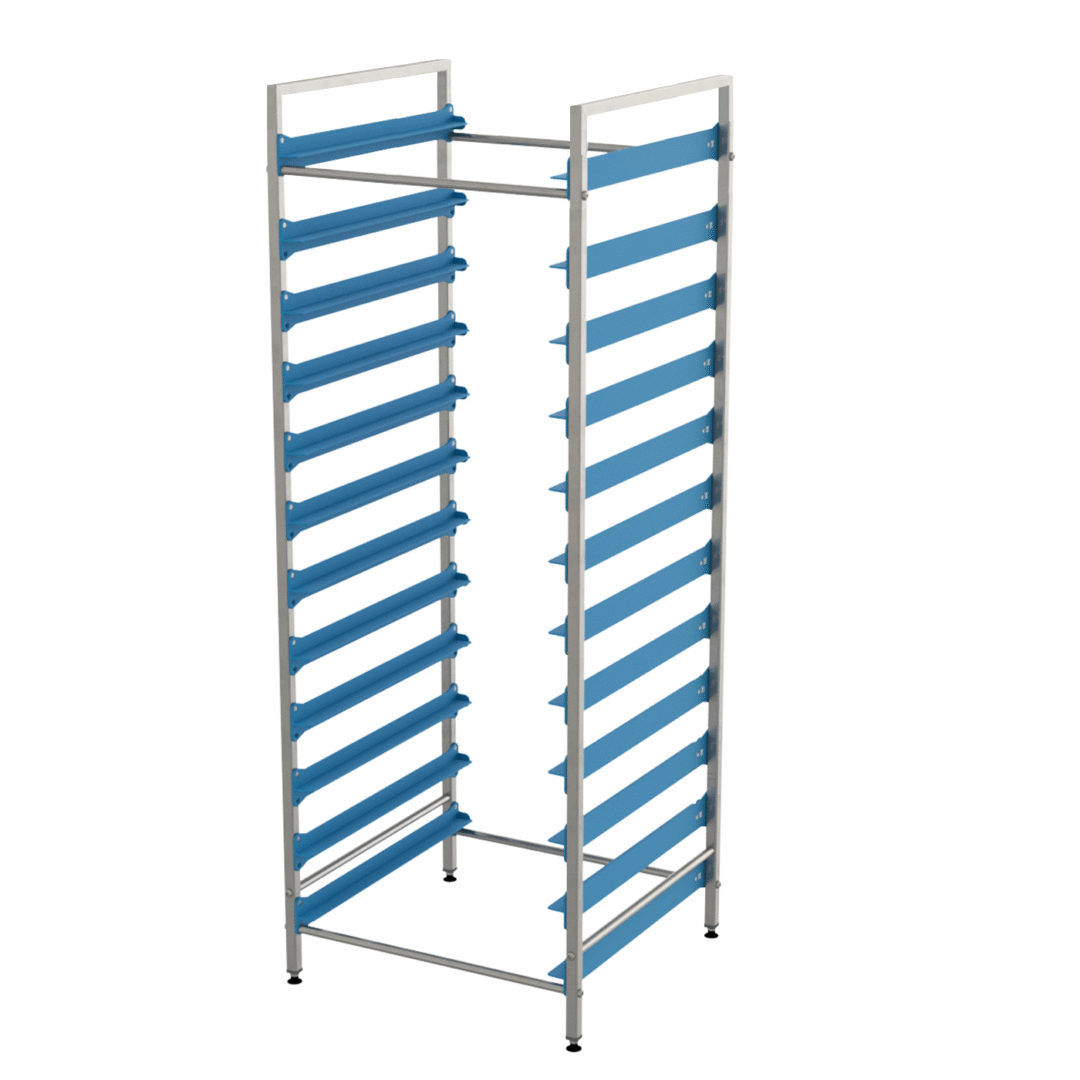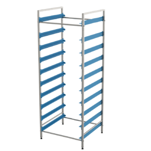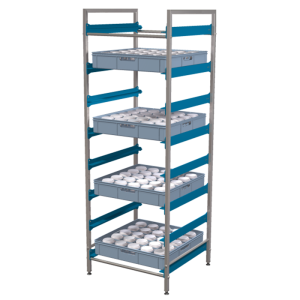 Sturdy stand for cups and glasses. Frame in stainless steel with four extra-high adjustable feet. Rails in polypropylene with stoppers at one end. The stand can be used in chilled rooms. Space for 5-12 dishwashing baskets.
