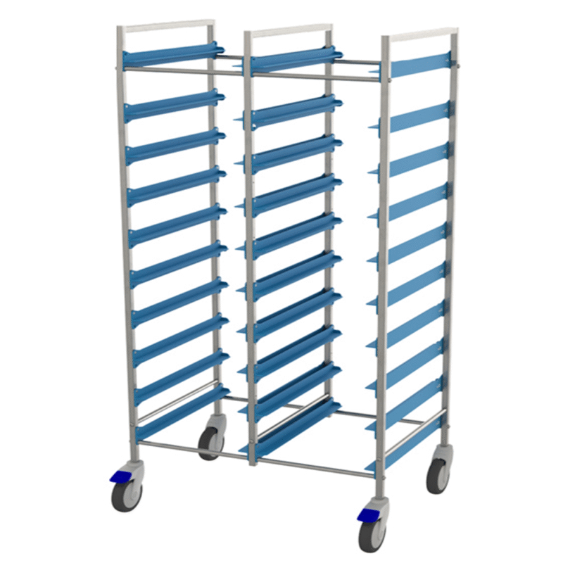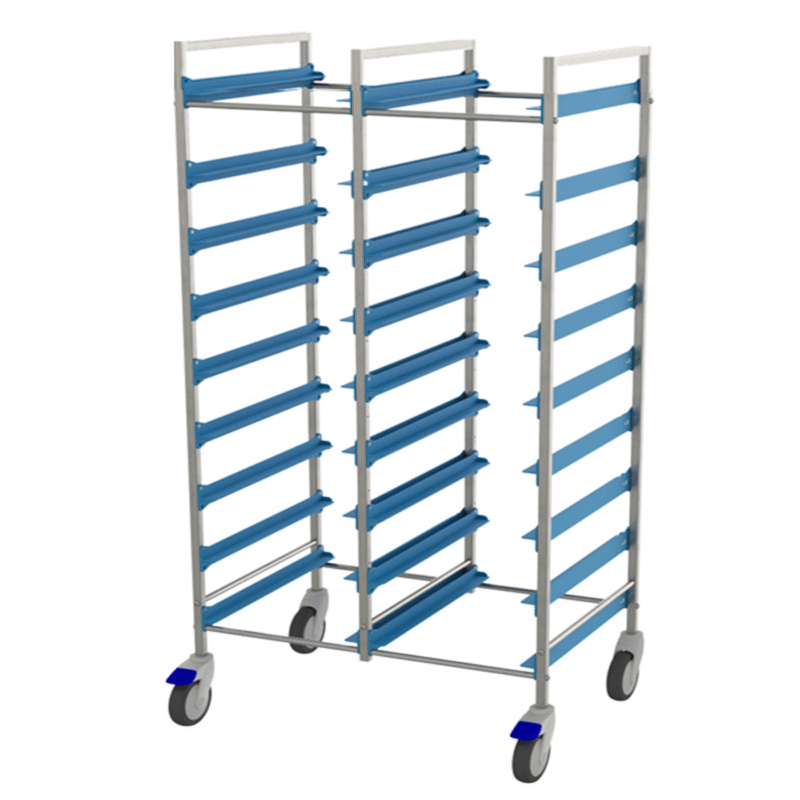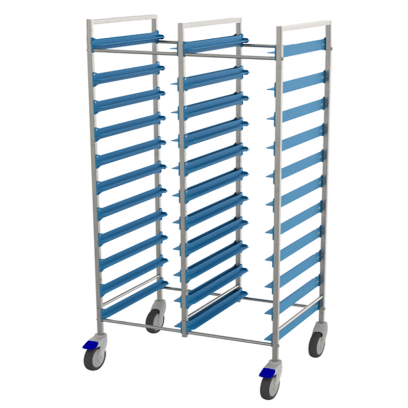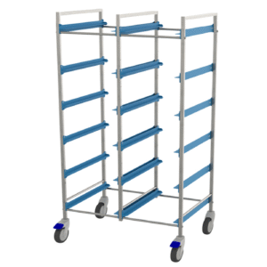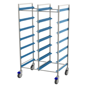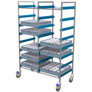 Basket trolley for the transport and storage of crockery in 46×46 cm dishwashing baskets.