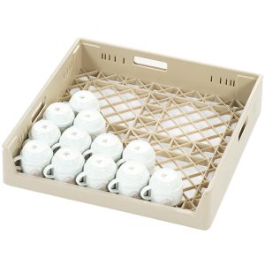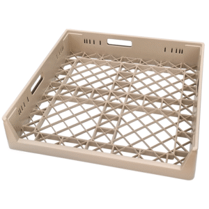 Injection moulded polypropylene, beige, stackable, with smooth sides and a low profile. Ergonomically placed handle diagonally for a better grip and balance. The basket features a unique construction with a rhombic, large-meshed bottom to allow optimal drainage of wash/rinse water. With a lightweight design, double walls, and stable construction, it is stackable, environmentally friendly in colour, and compatible with all commonly used dishwashing machines for 50×50 cm dishwashing baskets available in the market.