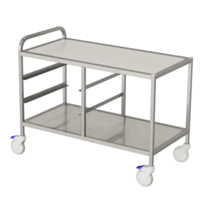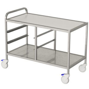 Assembled stainless steel pipe construction, featuring two reinforced stainless steel shelves with raised edges for items such as plate cassettes and cutlery drawers. Includes 2 gate sections with stainless steel gates. Sturdy and easy to manoeuvre, equipped with 125 mm ball-bearing swivel casters, 2 of which have brakes.