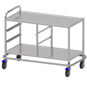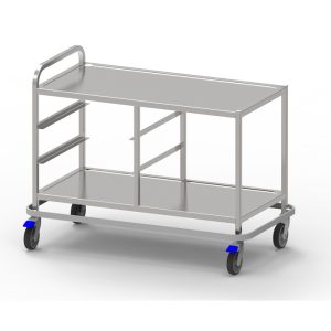 A versatile trolley designed for various purposes, such as table setup and clearing, transportation, and storage of goods. The trolley is equipped with rails for dishwashing baskets and stainless steel surfaces for items such as plate cassettes and cutlery drawers, among others. It can be customized with additional accessories like waste bins and tray holders.