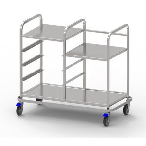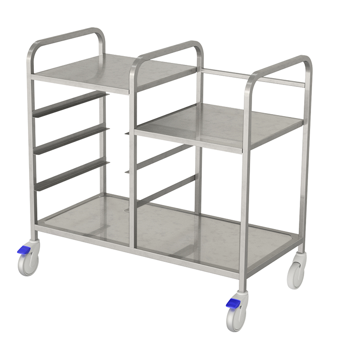Assembled stainless steel pipe construction, featuring two stainless steel shelves for items such as plate cassettes and cutlery boxes. Includes 3 gate sections with stainless steel gates. For added stability and interior protection, the trolley is equipped with a protective bumper. The lower part of the trolley consists of a reinforced shelf with a raised edge. Sturdy and easily manoeuvrable, it comes with 125 mm ball-bearing swivel casters, 2 of which are equipped with brakes.