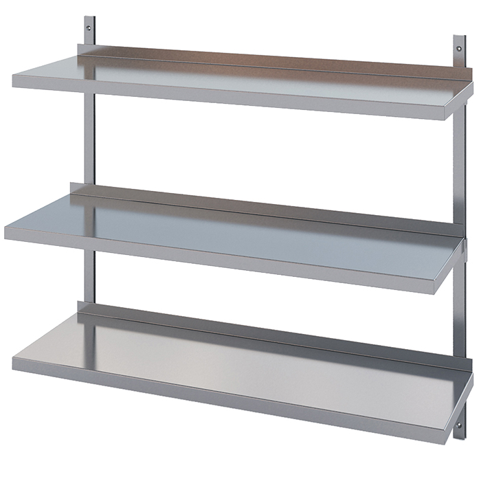 Shelves made of 1 mm stainless steel. Infinitely adjustable shelf brackets and wall rails made of anodized aluminium. Available with 1, 2, or 3 shelves.